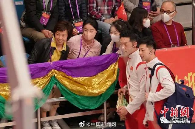 内地奥运健儿代表团入场后,马龙、许昕前去隔着栏杆与张怡宁和郭晶晶打招呼并合影。这张合影里有15枚奥运金牌。